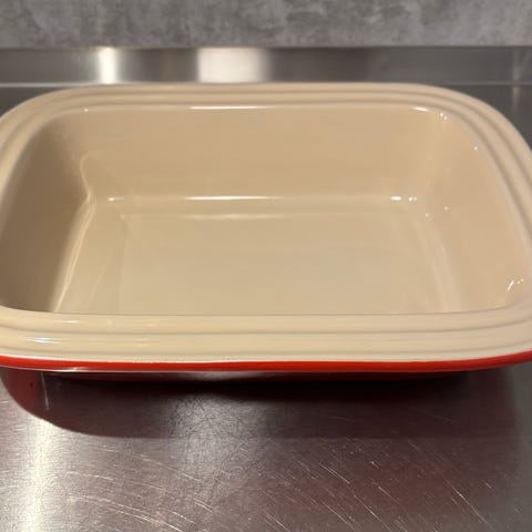 Le Creuset ildfast form med lokk i rød emaljert steingods. Rektangulær form med håndtak på kortsidene og matchende lokk med håndtak på toppen. Innvendig lys kremfarget glasur. Egnet til ovnsretter, baking og gratenger. Kan brukes i stekeovn og til servering ved bordet.