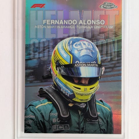 Topps Chrome F1 Max Verstappen Helmet Collection i holografisk utgave. Sist solgte inkl. frakt er $74, $78, $86 på EBay.