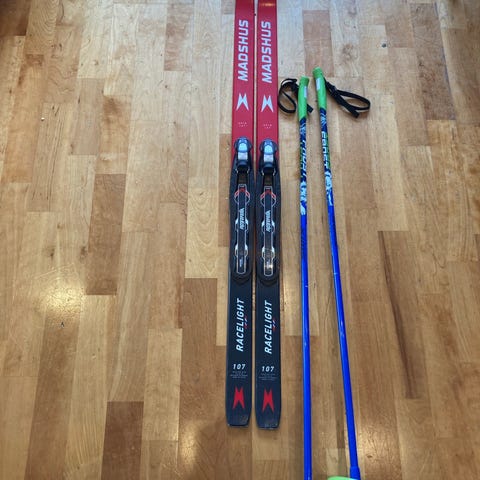 Madshus Super U smørefrie langrennski med Nemo rottefellabindinger. Swix staver 90cm