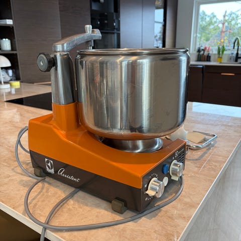 Electrolux Assistent Pro kjøkkenmaskin i svart utførelse med bolle i rustfritt stål. Maskinen har visp og annet standard tilbehør montert i bollen, samt sprutbeskyttelse i plast. Egner seg til elting, visping og blanding av ordinære, mindre, ulike typer deig og røre på kjøkkenet. Passer til daglig bruk i hjemmet ved baking og matlaging. Selges pga behov for kraftigere modell som kan ta større og tyngre deiger.