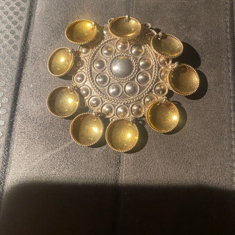 Sylvsmidja bunadssølje for dame i sølv med gullbelagte skåler. Søljen har tradisjonelt filigransarbeid i sølv og runde, gullbelagte skåler rundt kanten. Passer som hovedsølje eller brystsølje til bunad eller folkedrakt der denne typen sølv brukes. Festes med nål på baksiden.
