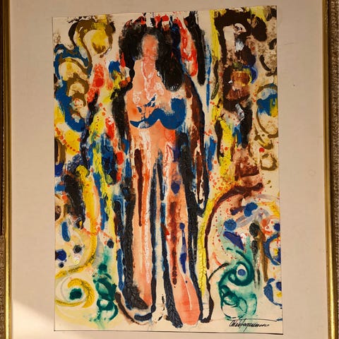Innrammet kunstplakat med tegning av stiliserte menneskefigurer utført i blå strek på lys bakgrunn. Bildet er montert i enkel ramme med passepartout. Motiv og signatur fremgår av bildene. Egner seg som veggdekor i stue, gang, kontor eller andre oppholdsrom.