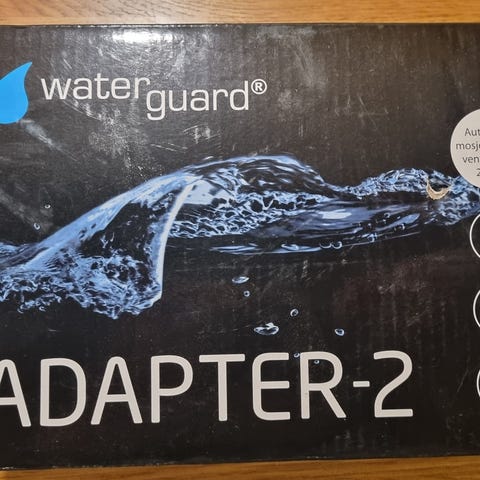 Waterguard Adapter-1 vannlekkasjesikring. Systemet består av adapterenhet med strømtilkobling og tilhørende sensorer/kabler. Brukes for deteksjon av vannlekkasje og automatisk avstenging av vann ved registrert lekkasje, typisk i rom som kjøkken, bad eller vaskerom. Leveres med tilkoblingskabler og komponenter som vist på bildene.