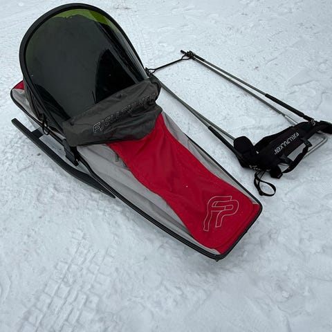 Fjellpulken barnepulk med drag i rød og grå farge selges. Pulk med fastmontert vindskjerm og trekk som beskytter barnet mot vind og snø. Leveres med drag og trekksele med polstring. Egnet for transport av barn på ski- og vinterturer. Sledemeier under for stabil gange i snø.