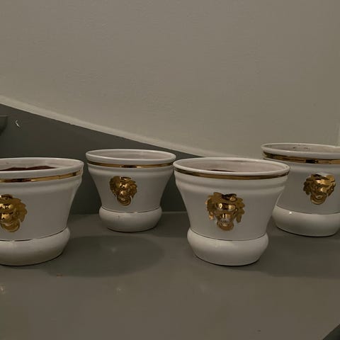 Blomsterpotte i keramikk med hvit glasur og gullfarget dekor i form av et løvehoder i relieff på sidene. Potten har dreneringshull i bunnen. Egnet til innendørs bruk med planter som trenger drenering. Passer som pyntepotte på bord, hylle eller vinduskarm.