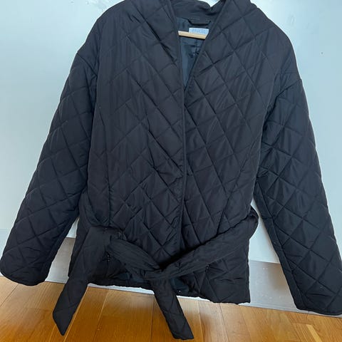 Arket jakke for dame i størrelse M. Jakken er svart og laget i polyester. Den har quiltet mønster med diagonale ruter og trykknapper foran. Modellen har rett, noe vid passform med snøring nederst for justering. Egnet som ytterjakke i overgangssesonger eller milde vinterdager.
