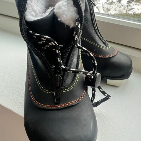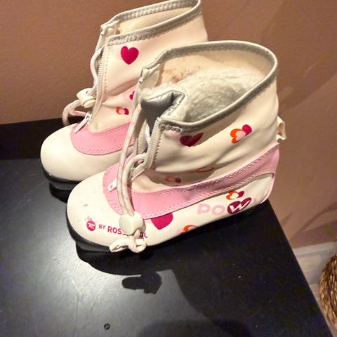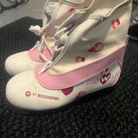 Rossignol barneskisko i størrelse 27. Skiskoene er hvite med rosa detaljer og små hjerter. De har mykt, fôret innside for ekstra varme og komfort. Lukkes med snøring foran for enkel justering rundt foten.
