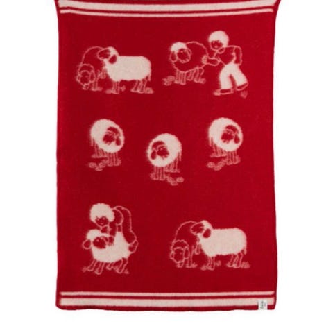 Blått Røros teppe med barn og sau