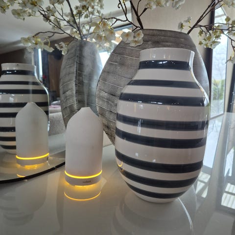 Kähler Omaggio vase i keramikk med horisontale striper. Vasen har en rund form med smalere åpning øverst. Passer til bruk med snittblomster, grener eller som dekorativt element alene i interiøret. Designet kjennetegnes av et enkelt og grafisk uttrykk med stripemønster rundt hele vasen.