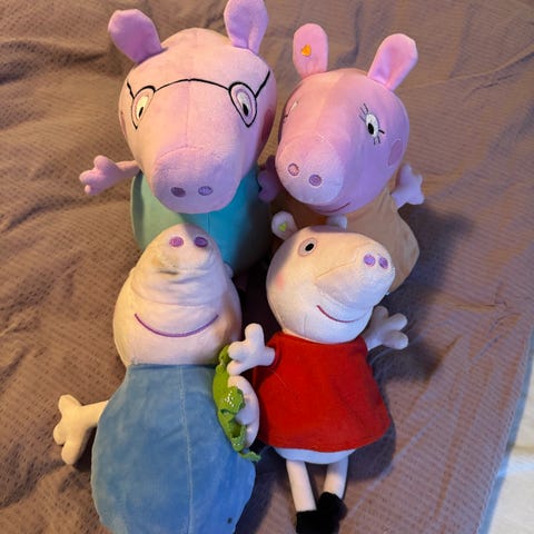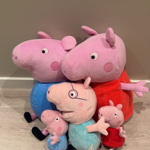 Peppa Gris kosedyr sett. Består av tre myke figurer fra Peppa Gris-universet i ulike størrelser og farger.