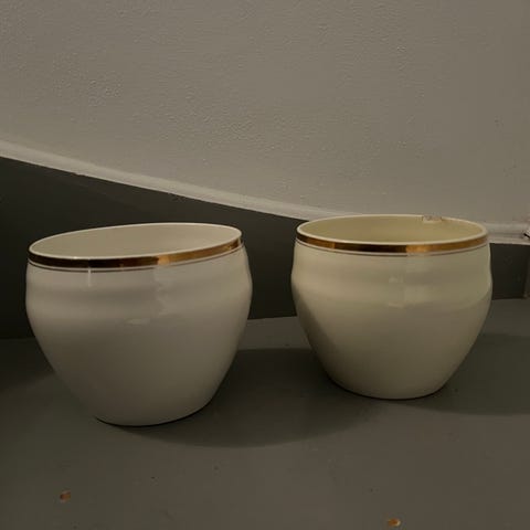Blomsterpotter i keramikk med hvit glasur og gullfarget dekor i form av et løvehoder i relieff på sidene. Pottene har dreneringshull i bunnen. Egnet til innendørs bruk med planter som trenger drenering. Passer som pyntepotte på bord, hylle eller vinduskarm.