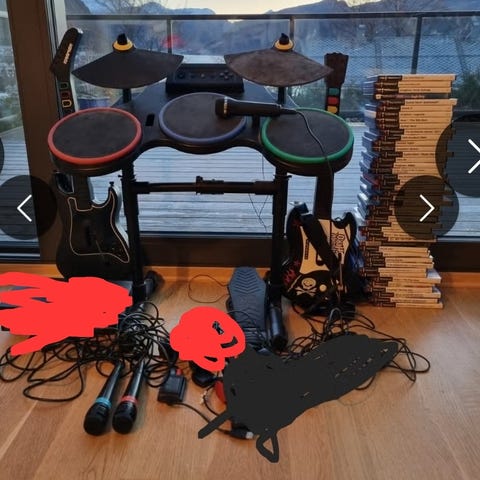 Har en stk trådløs fender type og en kablet gitar. Har også en mikrofon og et kamera. Selges helst samlet. Pris er for alt samlet. Kan også hentes i Stavanger/Sandnes området