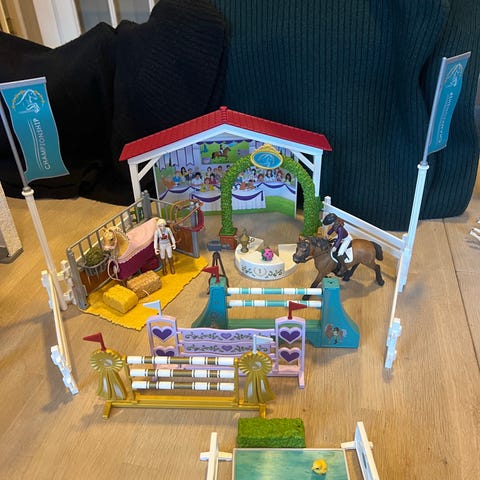 Settet består av flere hester med ryttere, samt tilbehør som rideport, gjerder, hinder og andre detaljer til ridebane. Delene er utformet som en stall- eller konkurransearena med inngangsportal, spranghindre, blomsterkasser og trær. Figurene er i typisk Schleich-størrelse og passer sammen med andre Schleich-hesteleker og tilbehør.
