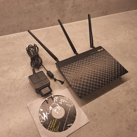 Asus RT-AC66U B1 trådløs dual-band gigabit router. Modellen støtter Wireless-AC1750 med dual-band-funksjon for samtidig bruk av 2,4 GHz og 5 GHz-bånd. Ruteren har flere eksterne antenner for bedre dekning og flere gigabit LAN-porter for kablede enheter. Egnet som sentral enhet i hjemmenettverk eller mindre kontornettverk, med støtte for både trådløse og kablede tilkoblinger.