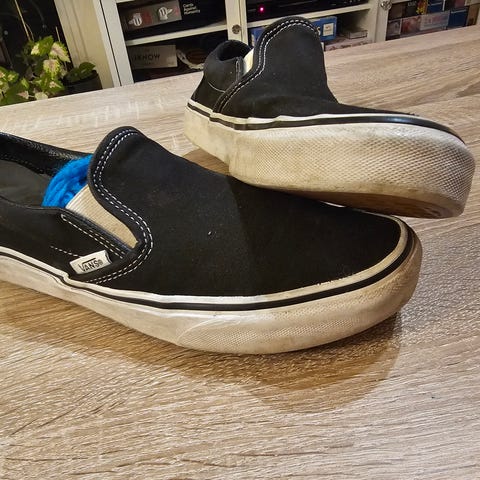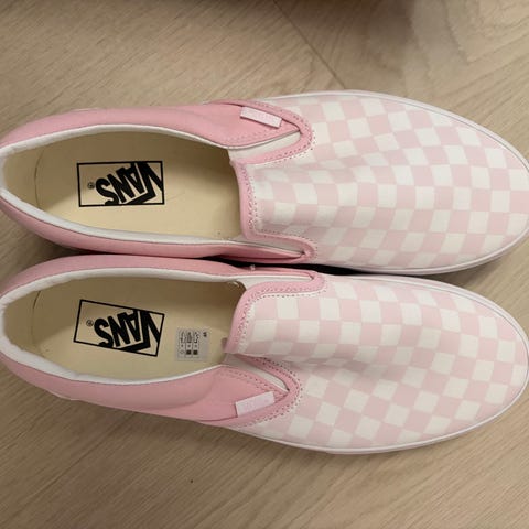 Vans slip-on sneakers i størrelse 37. Skoene er lys rød med hvit såle og klassisk Vans-merking. Modellen er uten lisser og tas enkelt av og på. Yttersålen har det karakteristiske Vans-mønsteret som gir godt grep. Passer som hverdagssko og til fritidsbruk.