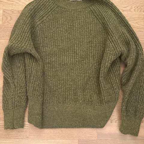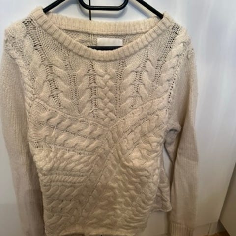 Primark Atmosphere genser for dame i størrelse 34. Genseren er beige og strikket i akryl. Foran har den et åpent hullmønster med flettestruktur, mens baksiden er glattstrikket. Genseren har rund hals og er noe lengre i fasongen, med ermer som går omtrent til underarmen. Passer til hverdagsbruk og kan kombineres med både bukse og skjørt.