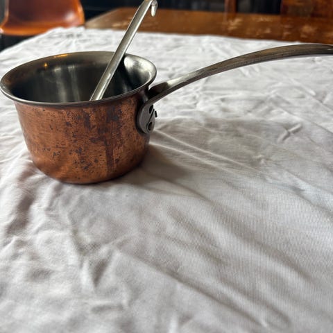 Selger en meget flott og velholdt kobbergryte med tilhørende lokk. Gryten har et tidløst uttrykk med to solide sidehåndtak i mørkt jern, som gir en fin kontrast til det varme kobberet.