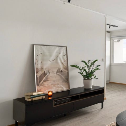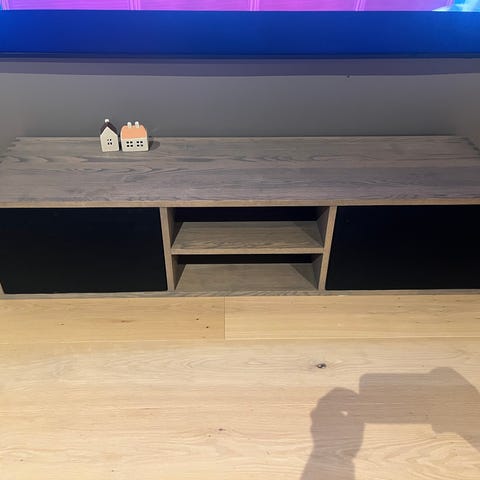 Vegghengt TV-benk i lys eikefinish. Benken har et rent og minimalistisk uttrykk med glatt front og skjult oppbevaringsrom. Egner seg godt under TV eller speil i stue eller oppholdsrom, og gir ekstra lagringsplass til for eksempel elektronikk, bøker eller annet tilbehør. Kan være en antydning til et rundt merke på toppen.