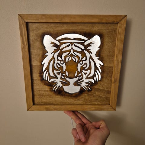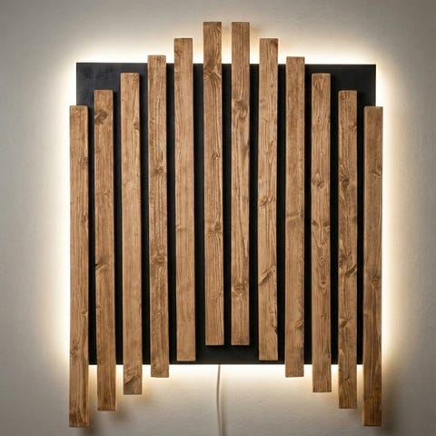 Selger en håndlaget veggdekor i tre med integrert LED-bakgrunnsbelysning (backlight). Dette er et fantastisk designelement som gir rommet en lun og koselig atmosfære, og fungerer som et stilig blikkfang både på dagtid og kveldstid.