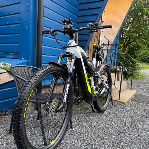 Robust fulldempet terrengsykkel med elmotor. 625Wh batteriytelse. Shimano 11-trinns gir. Magura hydrauliske skivebremser. CUBE Tubeless Ready hjulsett med gripende Schwalbe dekk. Vekt: 24, 6 kg.