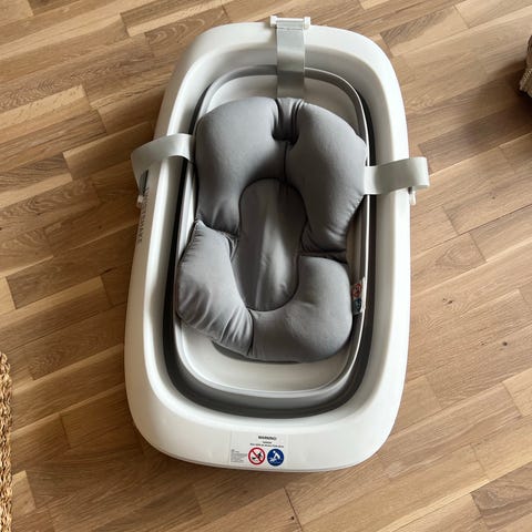 Sammenleggbart babybadekar i hvit og grå plast. Badekaret har sammenleggbare ben som gjør det plassbesparende ved oppbevaring. Det har integrerte holdere i kanten, samt en mykere grå innsats i bunnen for økt komfort. Badekaret kan brukes til bading av spedbarn og små barn, og er egnet for bruk på badegulv eller annet stabilt underlag. Det kommer også med en liten hellekopp i plast og en puteinnsats til baby, som kan brukes for ekstra støtte under badingen.