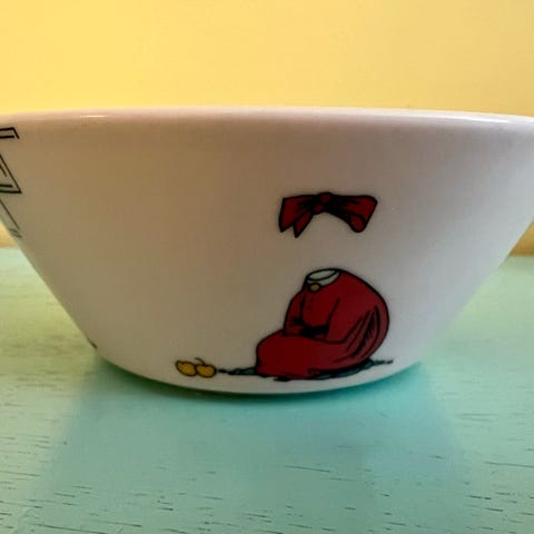 Arabia Mummi Lille My bolle i porselen. Bollen har rød utside og innside med motiv av Lille My fra Mummiserien. Egner seg til servering av frokost, dessert eller snacks. Tåler vanlig bruk på kjøkkenet, som for eksempel servering av varme og kalde retter.