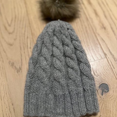 Søt strikkelue til baby (0-3 mnd) i myk kvalitet med stor fluffy dusk. Perfekt til trilleturer og kjølige dager.