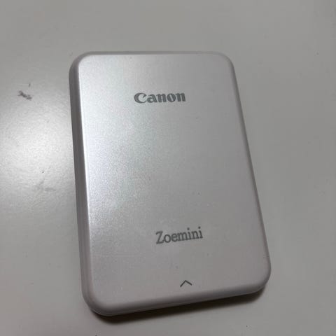 Canon Zoemini fotoprinter i rosa. Bærbar skriver for små fotoutskrifter direkte fra kompatible enheter. Enheten er kompakt og lett, egnet for utskrift av bilder i mindre format på spesialpapir. Fungerer som en mobil løsning for enkel og rask fotoutskrift uten behov for tradisjonell blekkpatron.