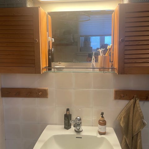 To skap og et speil gis bort. Har stått på bad. Må hentes etter 1800 i Damstredet.