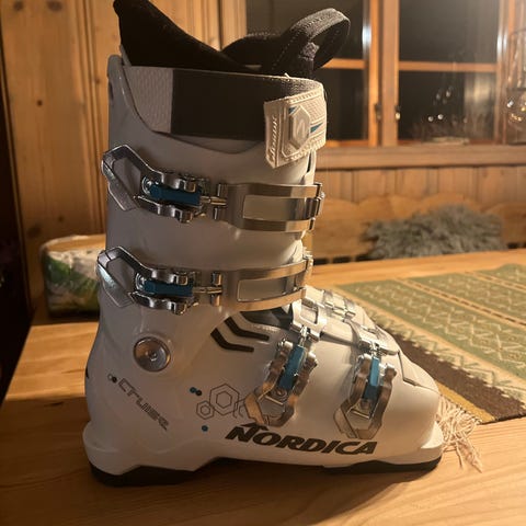 Nordica Cruise alpinstøvler i hvit farge og blå detaljer, wide versjonen i str 245/38,5. Brukt noen få ganger og mye sko igjen. Fås ikke kjøpt lengre i dag av denne fargen. Støvlene har fire justerbare spenner i metall og powerstrap øverst for bedre tilpasning rundt leggen. Innerstøvelen er polstret for komfort og støtte. Passer til bruk i alpinbakke med vanlige alpinbindinger.