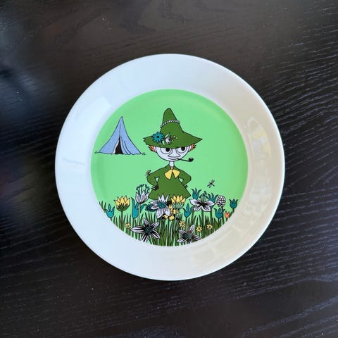 Arabia Mummi Snusmumrikken kopp og tallerken i grønt motiv. Serviset er laget i porselen og har illustrasjoner av Snusmumrikken og telt i et blomsterlandskap. Kopp og tallerken passer til servering av varme og kalde drikker samt måltider, og kan brukes til både barn og voksne som liker Mummi-motivene fra Arabia.