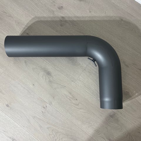 Ovnsrør i 125 mm diameter selges. Matt svart farge. Lengde ca 70 cm. 90 grader bend begge ender. Den ene siden har overgang til 150 mm, og har vært koblet til røykrør i pipa
