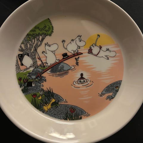 Arabia Mummi bol og tallerken i porselen med svart-hvitt motiv av Mummitrollet og andre figurer. Settet består av en dyp bolle og en flat tallerken med samme illustrasjonstema. Passer til servering av frokost, dessert eller andre måltider. Tåler vanlig bruk på kjøkkenet og er egnet for både barn og voksne som ønsker servise med Mummi-motiv.