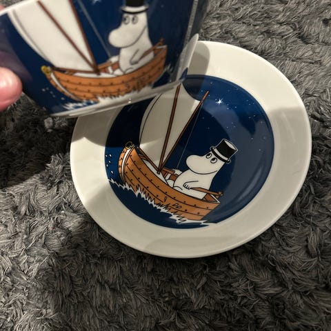 Arabia Mummi tallerken og skål i gul farge med motiv av Mummitrollet. Serviset er laget i porselen. Tallerken og skål kan brukes til servering av for eksempel frokost, dessert eller mellommåltider. Egner seg til daglig bruk på kjøkkenet eller som del av en Mummi-samling.