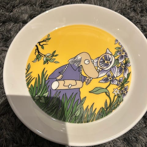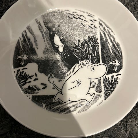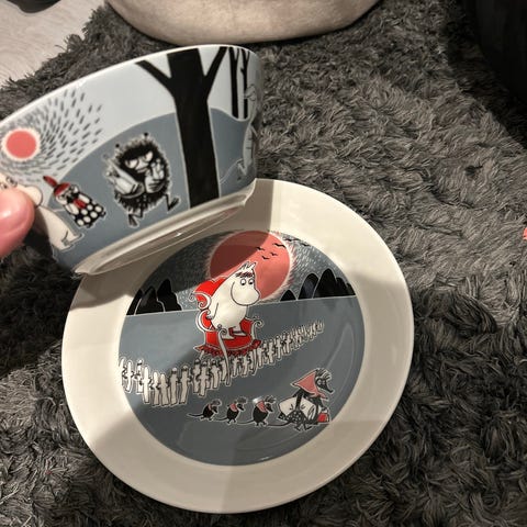 Arabia Mummi bolle og tallerken i porselen med oransje motiv. Settet består av en bolle og en flat tallerken med Mummi-illustrasjon. Egnet til servering av frokost, mellommåltider eller dessert. Tåler vanlig bruk på kjøkkenet og passer sammen med annet Mummi-servise fra Arabia.