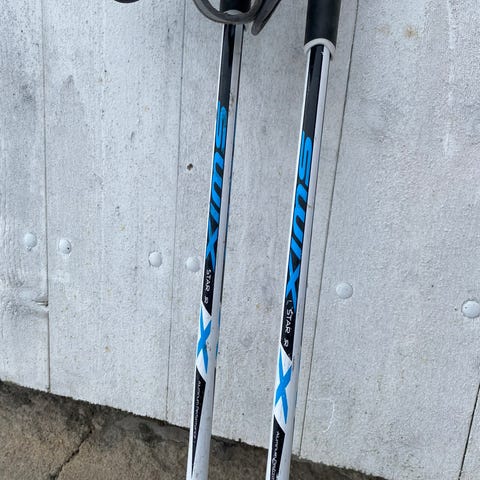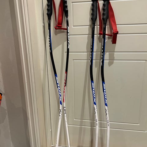 Swix staver i lengde 100 cm. Stavene har svart og rød staveskaft med hvite håndtak og grå håndstropper.