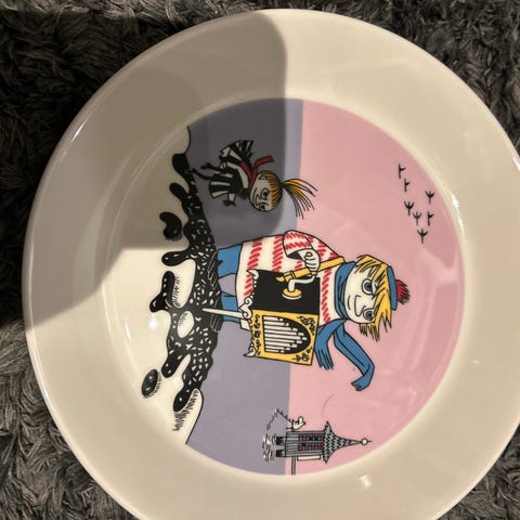 Arabia Mummi bol og tallerken i porselen med grått motiv. Settet består av en bolle og en flat tallerken med Mummi-illustrasjoner i gråtoner med røde detaljer. Egnet til servering av frokost, middag eller snacks. Tåler vanlig bruk på kjøkkenet og passer sammen med annet Mummi-servise fra Arabia.