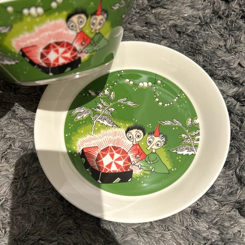 Arabia Mummi tallerken i porselen med gult motiv i midten. Tallerkenen har Mummi-illustrasjon i sort, hvitt og rødt mot gul bakgrunn. Egner seg til servering av for eksempel frokost, dessert eller småretter. Motiv og farger kommer tydelig frem på bildene.