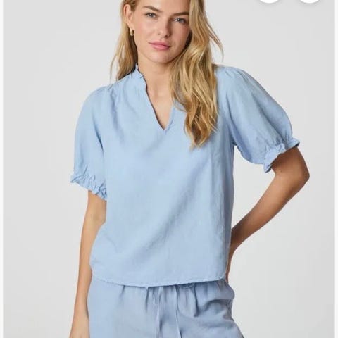Odesa Lin- og bomullsbluse i en nydelig lyseblå farge. Størrelsen er 38, og den er normal i størrelsen. Blusen er lite brukt.