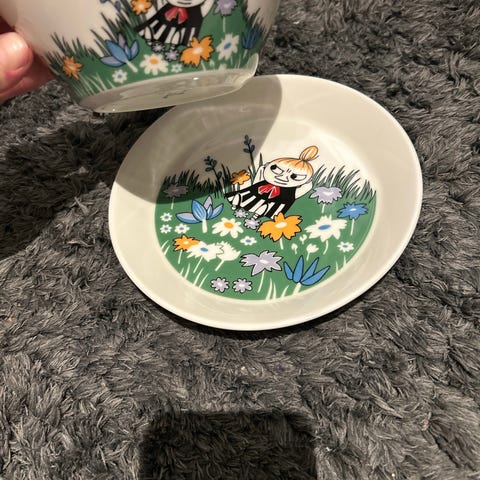 Arabia Mummi barneservise med bolle og tallerken. Serviset har blå bunnfarge med Mummi-motiv i flere farger. Egnet til bruk som barneservise til måltider som frokost, middag eller kveldsmat. Laget i porselen/keramikk som passer til daglig bruk på kjøkkenet.