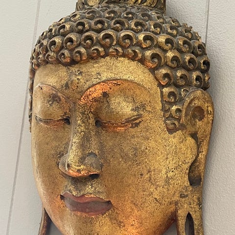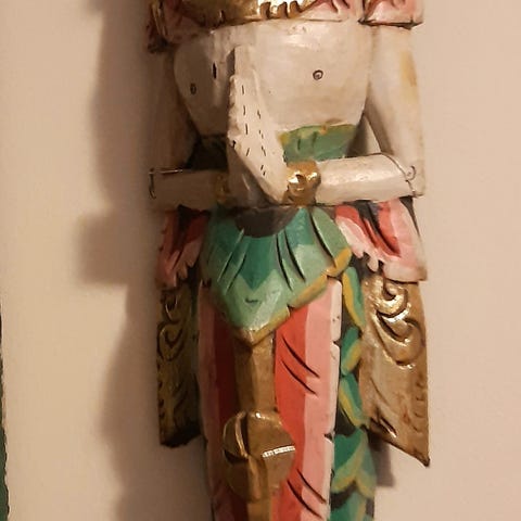 Vakker håndskåret veggmaske i lett tre, trolig fra India (Vest-Bengal). Masken forestiller den hinduistiske gudinnen Durga/Devi og er rikt dekorert med krone og tradisjonelle detaljer.