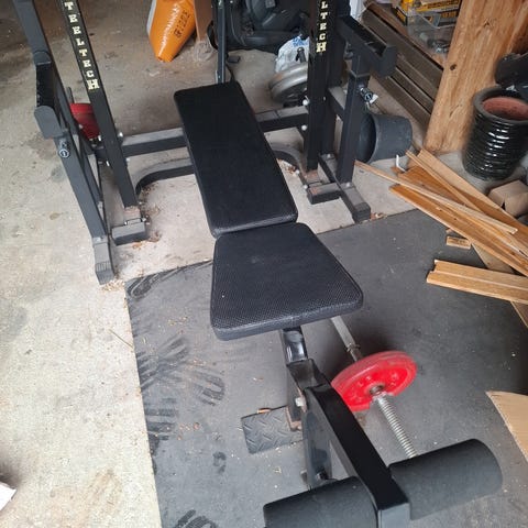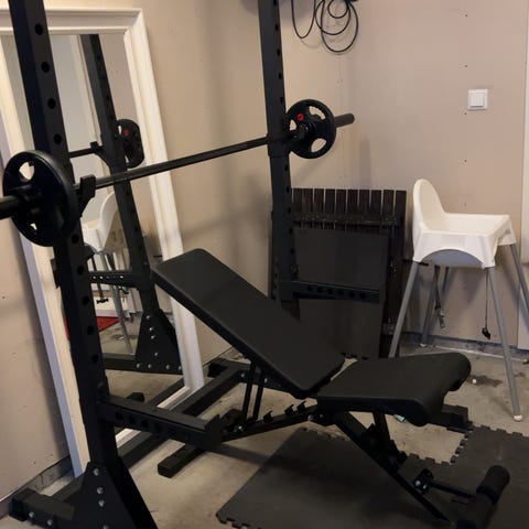 Treningsbenk stående som ikke blir brukt. Har også en solid nesten ubrukt 20kg stang 220 cm/50mm og vektskiver 2x 1,25/2,5/5kg fra sport outlet.