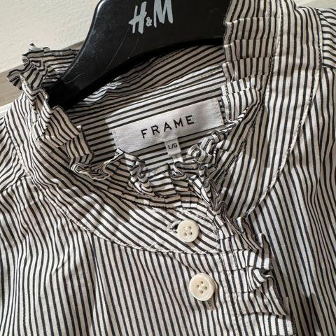 Silkebluse fra FRAME Denim. Røft og rocka, men også feminint uttrykk. Avslappet passform, med høy krage, brede mansjetter og skjortekant nederst. Men samtidig liten i størrelsen. Noe åpen bak. 100 % silke.