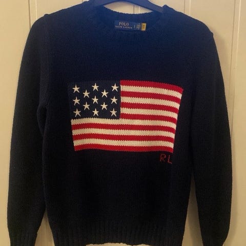 Ralph Lauren Polo genser for herre i størrelse M. Genseren er blå med rund hals og har et stort amerikansk flaggmotiv på brystet. Ribbestrikkede kanter nederst, i halsen og på ermene. Passer til hverdagsbruk og kan kombineres med både jeans og chinos.