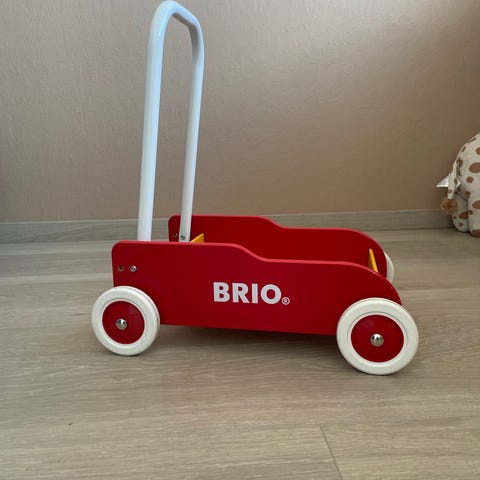 BRIO gåvogn selges. Klassisk gåvogn i tre med fire hjul og håndtak i metall. Egnet som støtte når barn skal øve på å gå, og som vogn til å frakte leker. Hjulene har gummibelegg som gir bedre friksjon mot underlaget. Håndtaket kan justeres i to posisjoner.