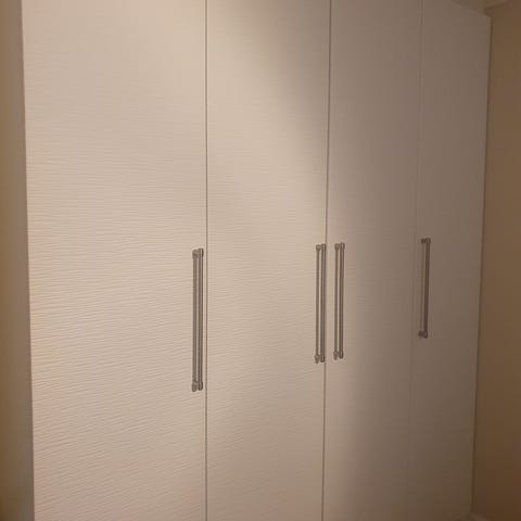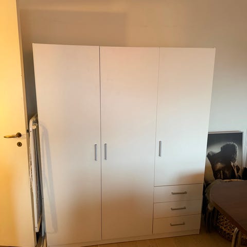 2 veldig pent brukte hvite garderobeskap gis bort. Romslige og praktiske, med mange hyller, og stang til kleshengere.