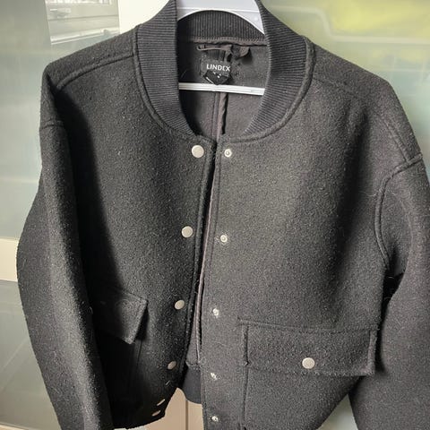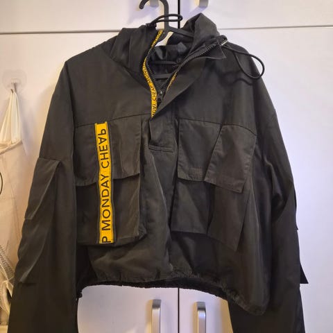 Pen tynn vårjakke med hette, snøring i livet og nederst. Lommer. Ermene kan brettes opp og festes med trykkknapper. Svært lite brukt.