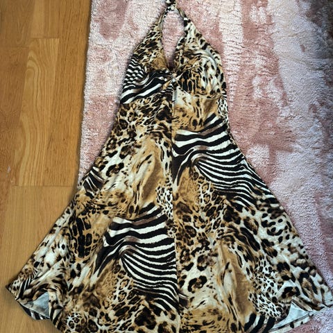 Sisters Point sommerkjole for dame i størrelse M. Kjolen er laget i polyester og har et flerfarget mønster med kombinasjon av dyreprint og blomster i hovedsakelig rosa, svart og hvitt. Modellen har tynne stropper, v-utringning og markert midje med mørk kontraststripe. Skjørtet er utsvingt og lengden går til over eller rundt kneet, avhengig av høyde. Passer som lett sommerkjole eller til uformelle anledninger.
