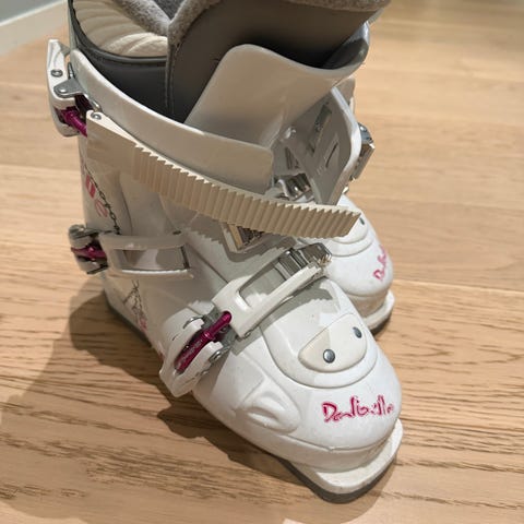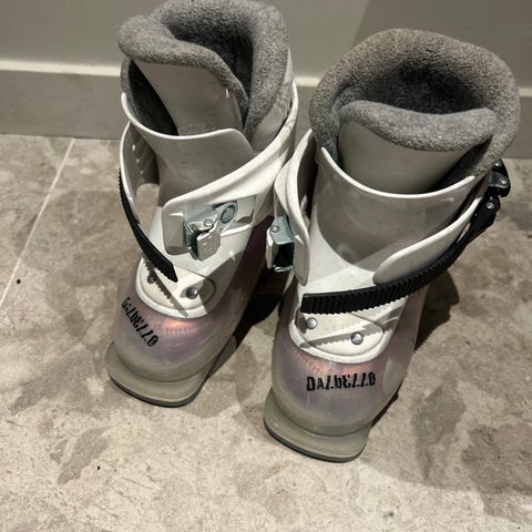Dalbello barnealpinstøvler i hvit og rosa plast med grått, polstret innerfôr. Støvlene har to justerbare spenner i plast/metall for god tilpasning rundt fot og legg. Egnet for barn til alpint og skikjøring i bakke. Passer til vanlige alpinski med kompatible bindinger.