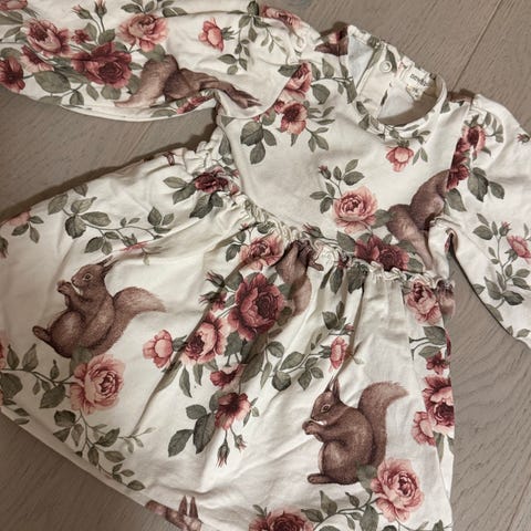 Newbie kjole for barn i størrelse 74. Kjolen er i rosa bomull og beregnet for jente. Den har lange ermer, strukturstrikket mønster på overdelen og knapper bak i nakken for enklere av- og påkledning. Nederst har kjolen en enkel kantdetalj. Passer til hverdagsbruk eller enklere pyntede anledninger.
